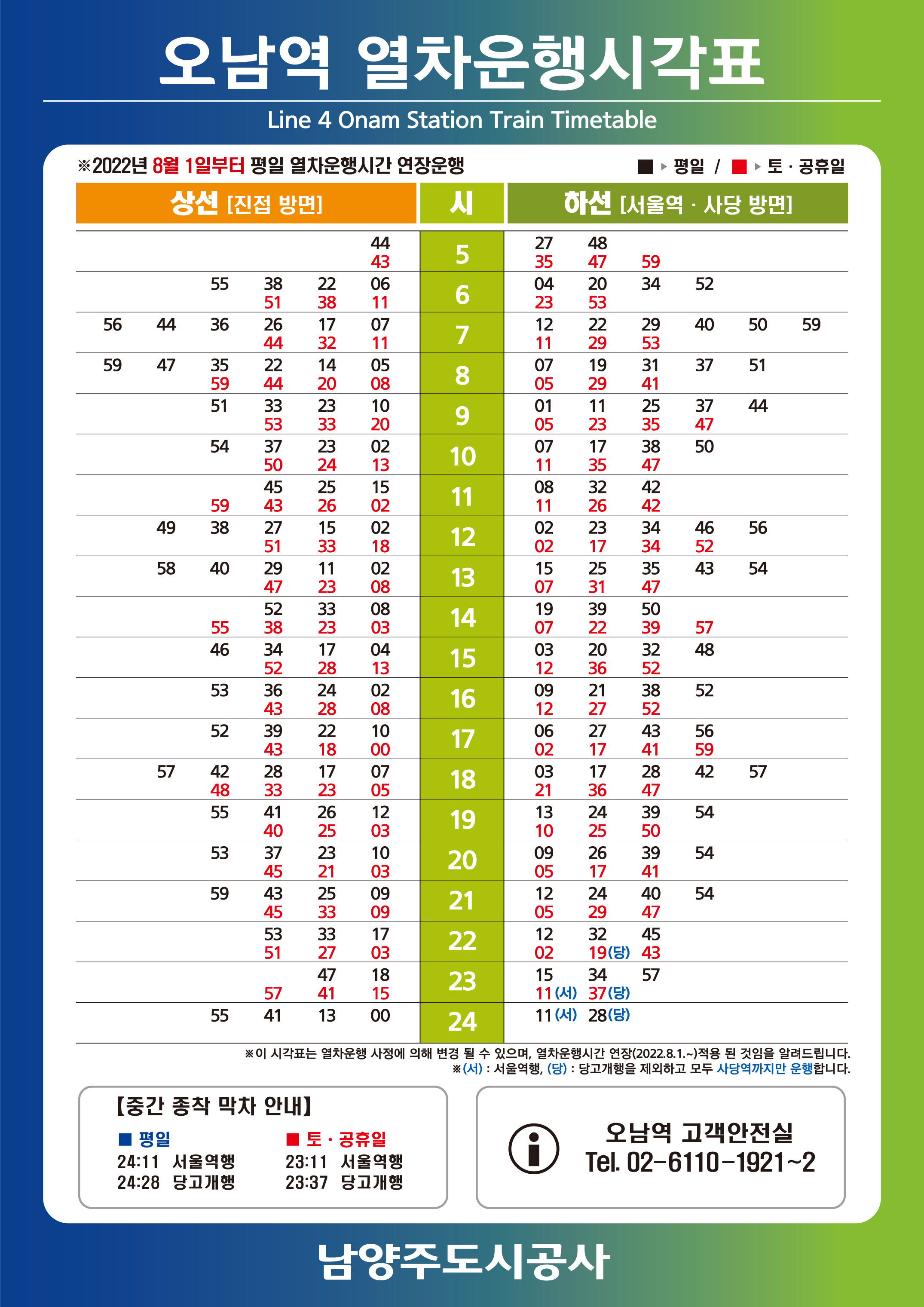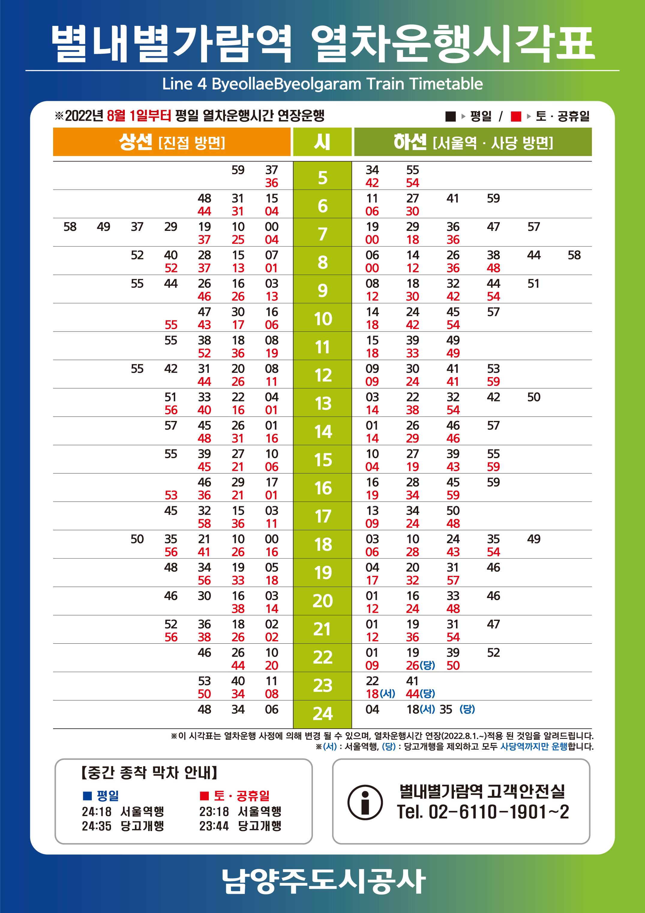 2022. 8. 1.(월)부터 평일 심야시간대 열차운행 시간이 아래와 같이 각 역사별 운행시간이 조정되오니 이용하시는데 참고 하시기 바랍니다.